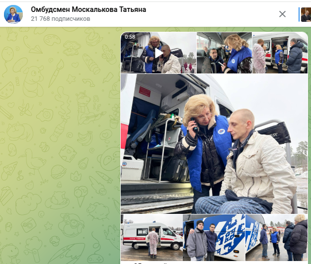 Омбудсмен Татьяна Москалькова в своём Telegram-канале показала кадры с обмена. Один из освобождённых, сидя в инвалидном кресле, едва сдерживал слёзы, созвонившись с мамой: