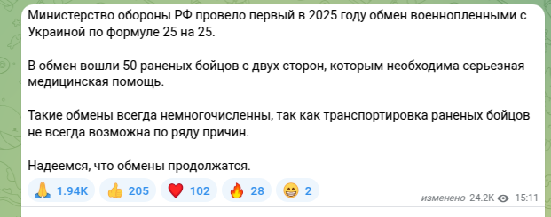 Вот что о первом в этом году обмене военнопленными с украинской стороной сообщили официально в Минобороны России: