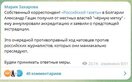 Мария Захарова осудила выдачу болгарскими властями Гацаку "чёрной метки".
