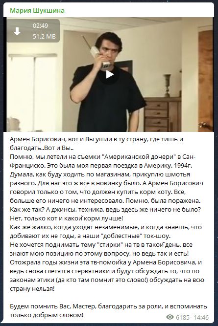 В конце поста она добавила, что будет помнить Мастера, благодарить за сыгранные им роли и вспоминать добрым словом.