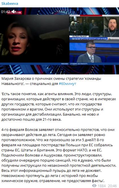 Смена протестной стратегии соратников Алексея Навального является следствием прямого западного влияния на своих агентов в России. Такое мнение Захарова высказала, говоря о неожиданном пересмотре планов руководителя региональных штабов Навального Леонида Волкова.