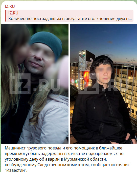 По информации iz.ru, машинист грузового поезда и его помощник в ближайшее время могут быть задержаны в качестве подозреваемых по уголовному делу об аварии в Мурманской области, возбуждённому Следственным комитетом.