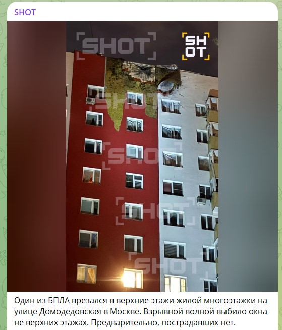 Помимо этого досталось и самой Москве. "На данный момент на территории города Москвы незначительно повреждена кровля дома от падения обломков сбитого БПЛА на Домодедовской улице. Соответствующие службы работают на месте", - указал столичный градоначальник.