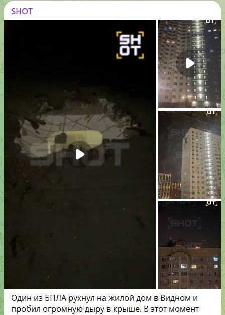 Так, последствия прямо сейчас устраняют в подмосковном Видном, где обломки дрона угодили в многоэтажку. На кадрах, которые появились в Сети, видно огромную дыру в крыше здания.