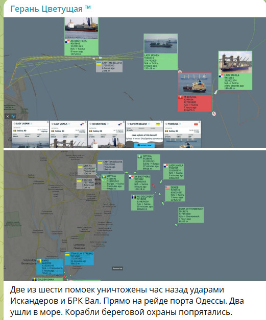 Две из шести помоек уничтожены час назад ударами "Искандеров" и БРК "Вал". Прямо на рейде порта Одессы. Два ушли в море. Корабли береговой охраны попрятались,