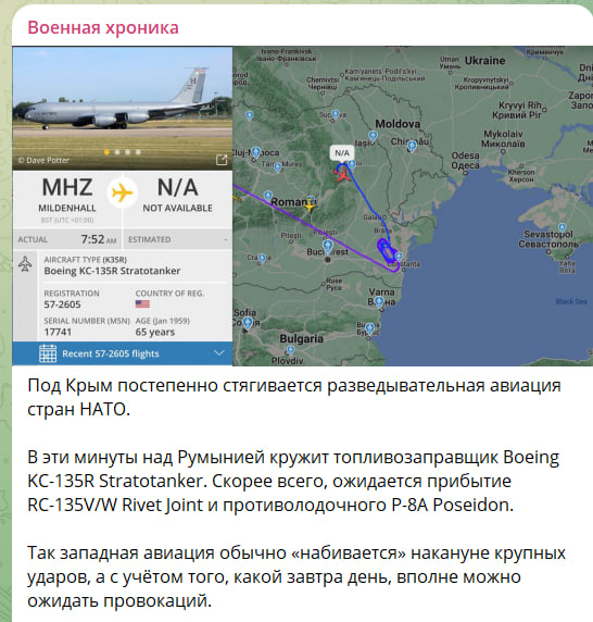 Так западная авиация обычно "набивается" накануне крупных ударов, а с учётом того, какой завтра день, вполне можно ожидать провокаций. <…> Не лишним также будет отметить, что полёты разведчиков НАТО вдоль Крыма совпали с активностью транспортной авиации Альянса. Третьи сутки подряд американские Boeing C-17A Globemaster таскают в Румынию что-то из Люксембурга. Вполне возможно, что дополнительный боекомплект к ATACMS/HIMARS.