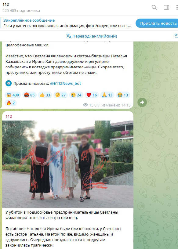 Смертельные ранения получили хозяйка дома - сообщается, что это генеральный директор завода ТИАЛ Светлана Филанович - и подруги-близнецы, Ирина и Наталья. Светлане было 65 лет, подругам - по 67 лет. Дружили женщины долго. И, вполне вероятно, общаться стали на фоне того, что и у Светланы есть сестра-близнец.