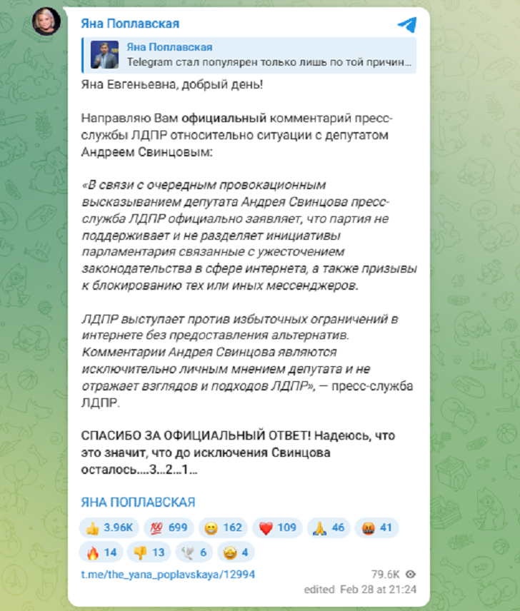 Позже она опубликовала официальный комментарий пресс-службы партии ЛДПР: