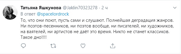 "То, что они поют, пусть сами и слушают. Полнейшая деградация жанров. Ни поэтов-песенников, ни поэтов вообще, ни писателей, ни художников, на ваятелей, ни артистов не даёт это время. Никто не станет классиком. Такое дно!" - не оценила "творение" @Jaklin70323278.