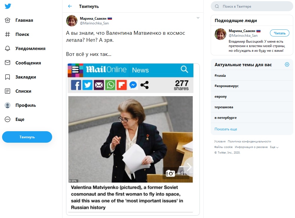 Британская газета перепутала Терешкову с Матвиенко, назвав последнюю первой женщиной, отправившейся в космос. Речь идёт о статье Daily Mail о поправках в Конституцию России.