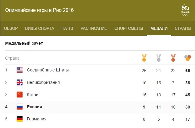 Медальный зачет Олимпиады в Рио: 15 августа 2016 года