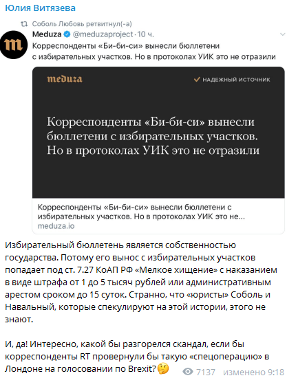 В частности, "Медуза" обратила всеобщее внимание на то, что журналисты BBC якобы вынесли избирательные бюллетени с избирательных участков, при этом представители УИК не отобразили этого в отчётах.