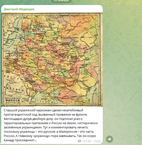 По словам зампреда Совбеза России Дмитрия Медведева, сегодня "старший украинский наркоман сделал незатейливый пропагандистский ход, вызванный провалом на фронте".