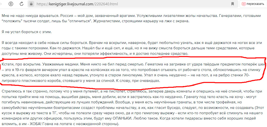 Авторы ресурса сейчас пытаются разобраться в достоверности "запасной посмертной записки", к тому же особо "заточенной" на отмывку от подозрений в избиении тех, кто довёл "Мурза" до весьма сомнительной смерти: