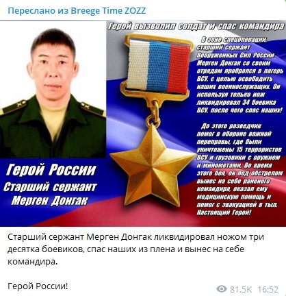 Что интересно, в украинских пабликах и соцетях распространяется ещё более впечатляющая история о подвиге Мергена Донгака. Утверждается, что ещё до боя на переправе старший сержант со своим отрядом пробрался в лагерь ВСУ и с одним ножом ликвидировал 34 украинских нациста и спас пленённых русских военных. А уже возвращаясь назад, Мерген Донгак увидел бой на переправе и со своим отрядом оказал помощь обороняющимся. Так молодой старший сержант стал не только Героем России, но и главной страшилкой ВСУ.