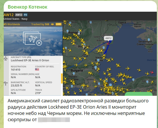 Да, БПЛА и самолёты-разведчики США продолжали кружить, однако на столь значительном расстоянии, над Румынией и Болгарией, что разведка не могла дотянуться до наших территорий. Ситуация же с Lockheed EP-3E Orion Aries II многое меняет: его радиус разведки кратно больше, чем у RQ-4. Так, пролетая над Румынией, он и вольготно себя чувствует и отслеживает нашу территории, предоставляя ВСУ необходимые данные.