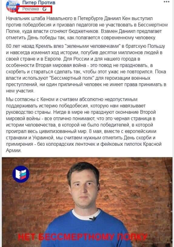 Петербургский муниципальный депутат, сторонник Алексея Навального Даниил Кен назвал мероприятия по случаю Дня Победы "победобесием" и призвал педагогов не участвовать в акции "Бессмертный полк", потому что детям "незачем смотреть на фейковые пилотки и колорадские ленточки". По крайней мере, так его слова трактуют в рекламном посте. Однако сам Кен и Алексей Навальный заявляют, что стали жертвами фейка и выдвигают обвинения против тех, кто рассказал о манипуляциях с шествием "Бессмертного полка".
