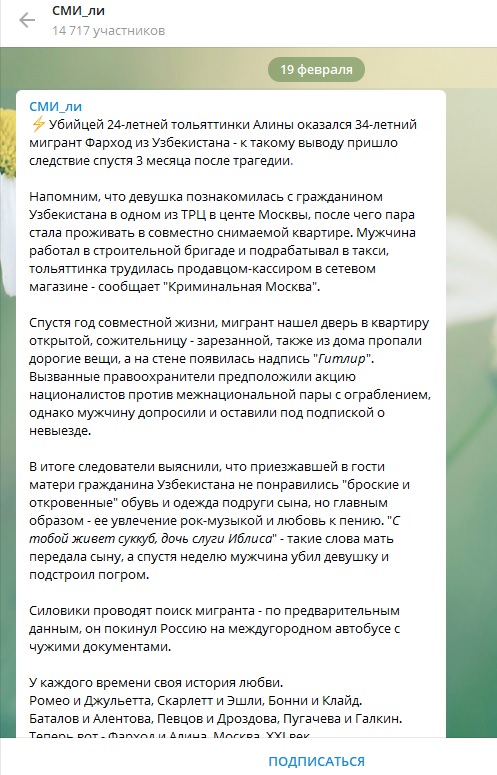 В социальных сетях распространяют сообщения об убийстве в Москве русской девушки, приехавшей из Тольятти. По словам авторов сообщений, убийцей мог быть её друг по имени Фарход. Якобы мигрант расправился с девушкой после слов матери о суккубе. Однако официально информация не подтверждена.