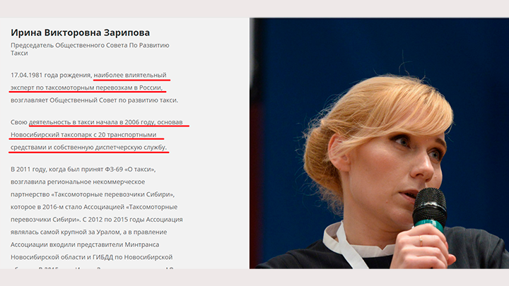 Ирина Зарипова - 42-летняя уроженка Новосибирской области, которая на сайте организации позиционирует себя как "наиболее влиятельный эксперт по таксомоторным перевозкам в России".