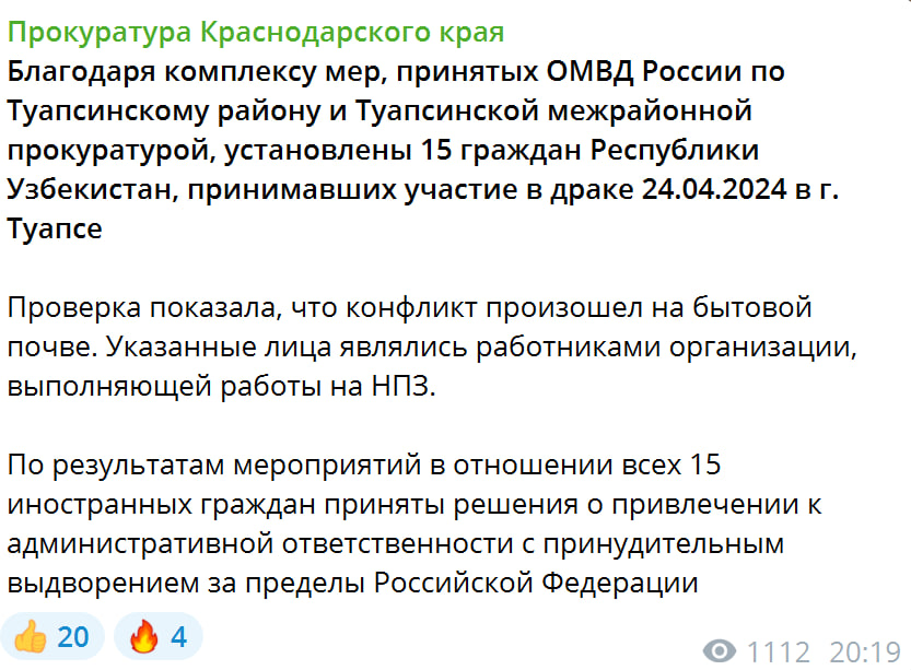 В прокуратуре Краснодарского край сообщили, что к инциденту, случившемуся 24 апреля, причастны граждане Узбекистана. Все 15 человек были задержаны по горячим следам.