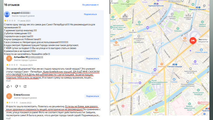 Спустя два года ситуация почти не изменилась. В черте Апраксина Двора и прилегающих к комплексу зданиях работает минимум 7 хостелов. Как следует из отзывов, это общежития для гастарбайтеров, где за отдельную плату можно приобрести регистрацию.