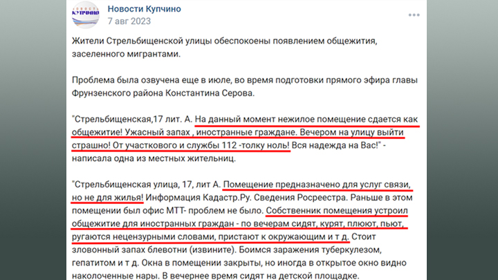 ЖИТЕЛИ ПЕТЕРБУРГА МЕСЯЦАМИ И ГОДАМИ ВЫНУЖДЕНЫ ДОБИВАТЬСЯ ЗАКРЫТИЯ МИГРАНТСКИХ ОБЩЕЖИТИЙ. СКРИНШОТ ПОСТА В СЕТИ "ВК" В ПАБЛИКЕ "НОВОСТИ КУПЧИНО"