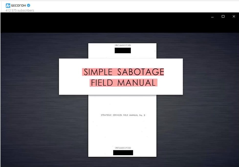 В 2008-м году был рассекречен один документ. Это методичка по саботажу в тылу противника. Она называлась Simple Sabotage Field Manual. Буквальный перевод – "Простое полевое руководство по саботажу". Вот так он выглядел. Она была написана в 1944-м году американским Управлением стратегических служб, предшественником ЦРУ, для противодействия врагу.