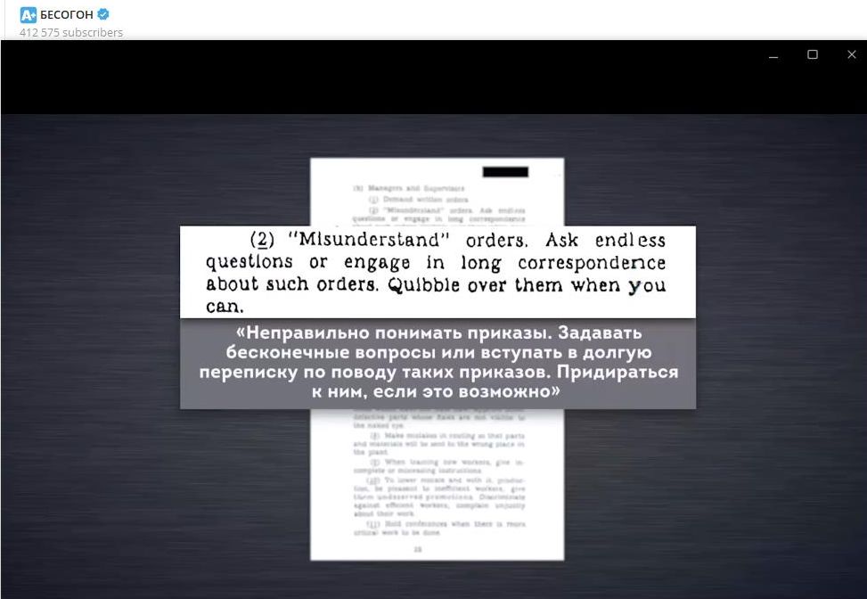 Как справедливо заметил Михалков, "Простое полевое руководство по саботажу" представляет собой набор пошаговых инструкций для рабочих и сотрудников различных предприятий. Причём рассчитан этот документ был как на простых работников, так и на инженеров, и даже на руководящий состав.