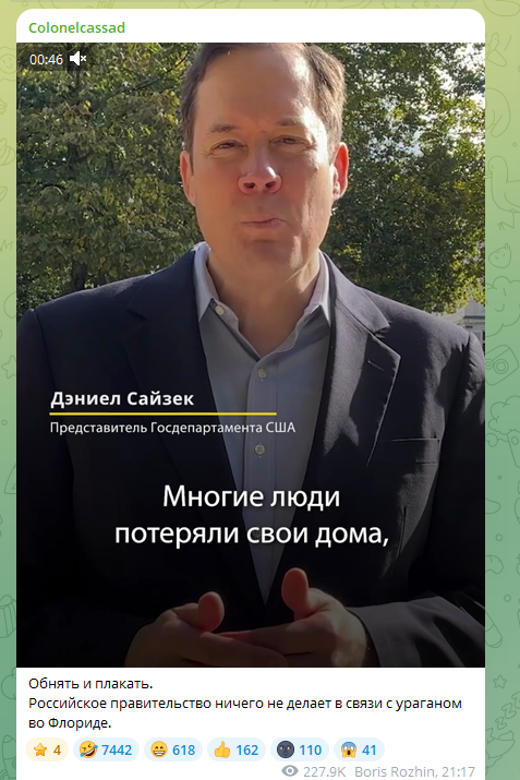 Хотя нынче некоторые персонажи в попытках как-то притянуть Россию к урагану "Милтон" просто превзошли себя. А заодно попрали законы элементарной логики. Вот, например, представитель американского Госдепа Дэниел Сайзек заговорил о "сложной ситуации во Флориде" так:
