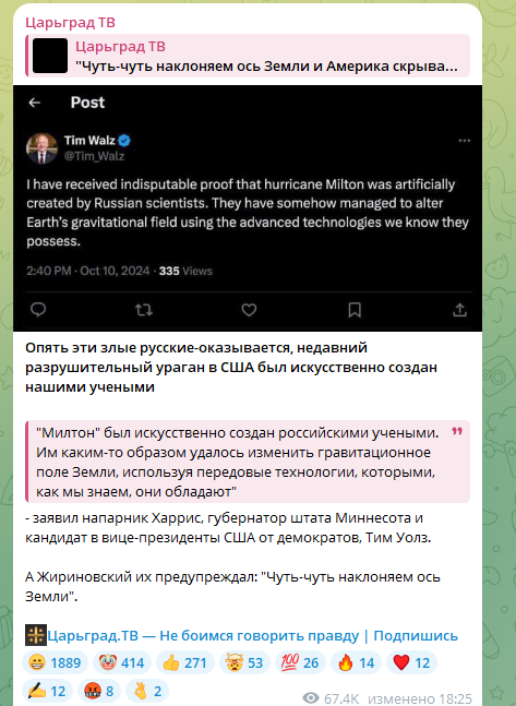 Ближайший соратник Камалы Харрис Тим Уолз заявил, что ураган "Милтон" создали русские. Причём путём изменения гравитационного поля Земли. Похоже, политик Владимир Жириновский с того света всё-таки обвёл вокруг пальца демократов США. Ведь именно он грозился: "Ночью наши учёные чуть-чуть изменят гравитационное поле Земли, и Америка будет под водой". Похоже, эпатаж нашего Владимира Вольфовича кто-то принял за чистую монету.