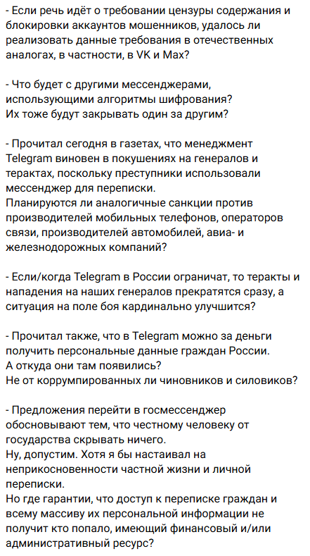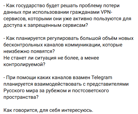 Шестое - не будет ли для государства хуже, если население полностью пересядет на VPN или перейдёт на другие мессенджеры с шифрованием? Как оно планирует контролировать большое количество альтернативных каналов коммуникации, которые появятся на месте одного "убитого" Telegram?