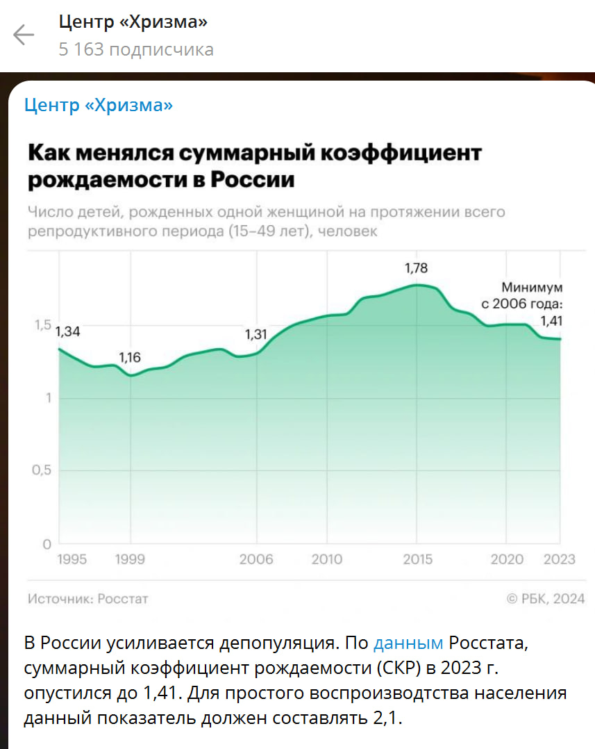 Росстат зафиксировал снижение суммарного коэффициента рождаемости в 2023 году. Данный показатель опустился до 1,41. Для простого воспроизводства населения данный показатель должен составлять 2,1.