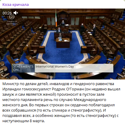 В общем, Родрик О’Горман зачитал свою речь до конца, и она имела во всех смыслах оглушительный успех. При этом стоит отметить, что ирландский министр, занимающий свой пост уже четыре года, не первый раз попадает в некрасивые и даже скандальные истории. В частности, в 2020 году он объявил о намерении упростить для подростков младше 16 лет процедуру изменения своего пола. Заметьте, этому человеку в Ирландии поручено следить за работой различных органов по уходу за детьми. Этот же человек обязан бороться с чиновничьим бюрократизмом.