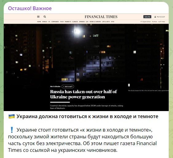 FT писала со ссылкой на украинских чиновников, не называя, как это принято в западной журналистике, имён. Мол, украинцам предстоит провести зиму в холоде и темноте из-за разгрома русскими электростанций. Украинских чиновников в Минэнерго страны это очень раздосадовало. И они решили обвинить британцев в работе на Россию (!).