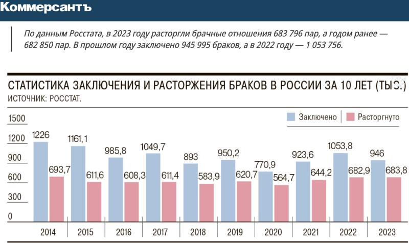 "Коммерсантъ" также приводит статистику, которая гласит, что в прошлом году было зарегистрировано более 683 тысяч бракоразводных процессов. Вместе с тем в 2023 году брак заключили более 945 тысяч граждан.