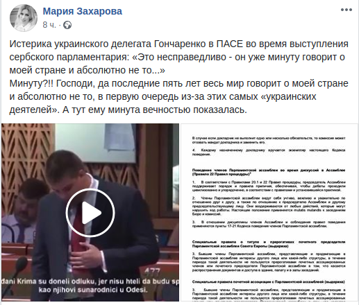 Официальный представитель МИД РФ Мария Захарова у себя на странице в Facebook не сдержала эмоций и не без сарказма ответила Гончаренко на его "истерику".