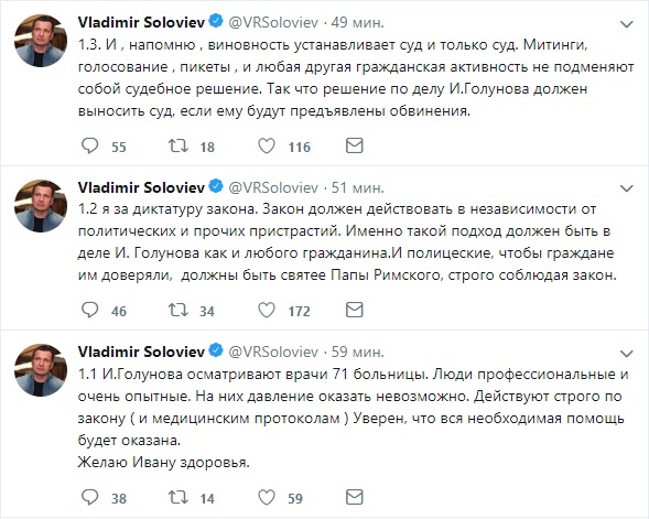 "Напомню, виновность устанавливает суд и только суд. Митинги, голосование, пикеты и любая другая гражданская активность не подменяют собой судебное решение", - написал Соловьев, подчеркнув, что именно судья должен выносить вердикт. Естественно, в том случае, если дело Голунову предъявят обвинения.
