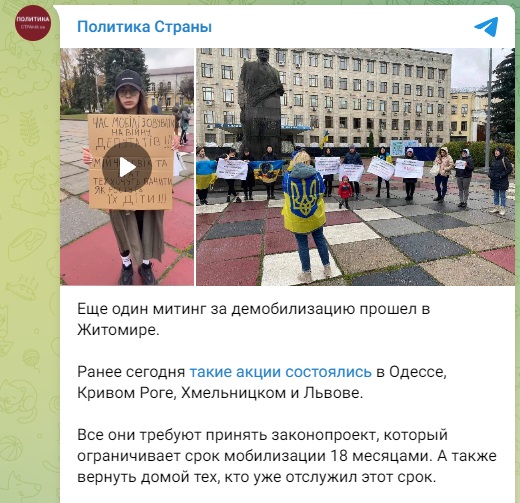 На Украине прошли митинги, родственники призванных на фронт требовали вернуть их домой. Судя по видеозаписям, преимущественно выходили на улицы с плакатами женщины, заявляя, что мужчинам нужен отдых и ротации в ВСУ нет.