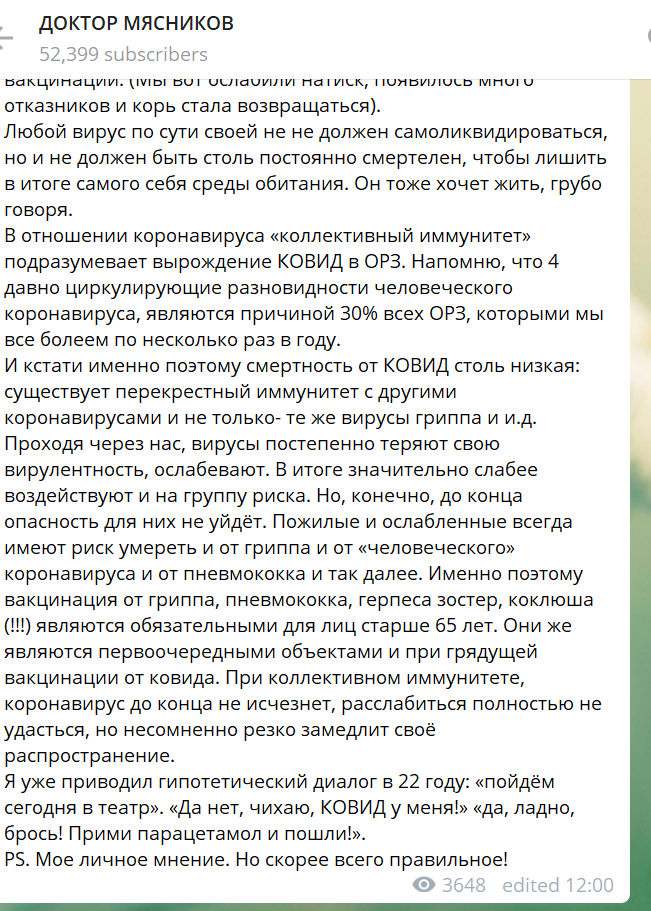 Он также добавил, что большинство людей, в том числе врачи, неправильно понимают словосочетание "коллективный иммунитет". "Вот сейчас мы все переболеем или вакцинируемся - и ковид исчезнет из нашей жизни!" - сформулировал Мясников их утверждения. "Увы, не так", - резмировал врач: "При коллективном иммунитете коронавирус до конца не исчезнет, но, несомненно, резко замедлит своё распространение".