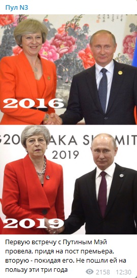 "Первую встречу с Путиным Мэй провела, придя на пост премьера, вторую - покидая его. Не пошли ей на пользу эти три года".