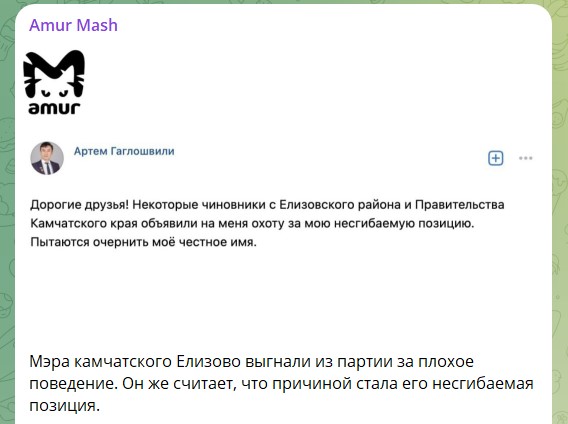 "Дорогие друзья! Некоторые чиновники с Елизовского района и правительства Камчатского края объявили на меня охоту за мою несгибаемую позицию. Пытаются очернить моё честное имя", - написал Гаглошвили в соцсетях.