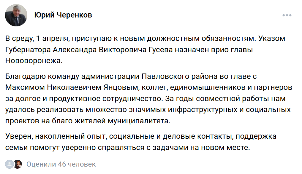 30 марта Черенков опубликовал на своей странице в "ВКонтакте" пост, в котором сообщил о своём назначении, поблагодарил администрацию Павловского района за долгое сотрудничество с ним и выразил уверенность, что его опыт и деловые контакты помогут в работе на новом месте.