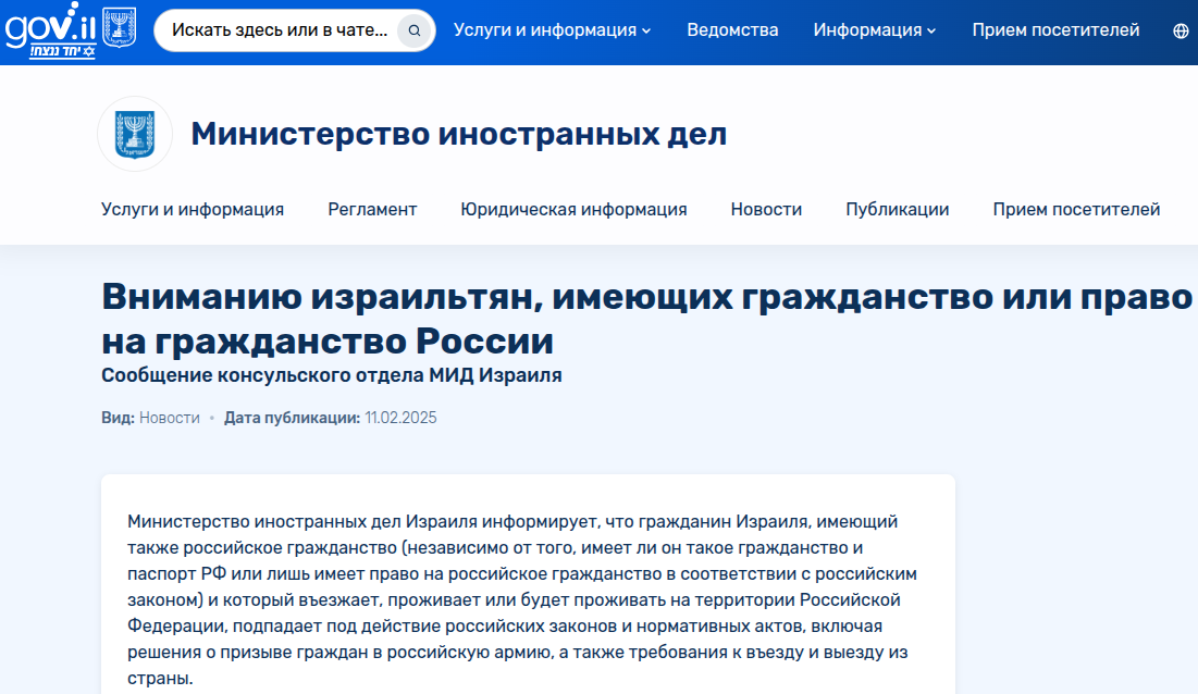 Министерство иностранных дел Израиля внезапно озадачилось судьбой русских израильтян — тех, кто имеет гражданство Российской Федерации. На официальном сайте внешнеполитического ведомства вдруг появилась информация о том, что "гражданин Израиля, имеющий также российское гражданство (независимо от того, имеет ли он такое гражданство и паспорт РФ или лишь имеет право на российское гражданство в соответствии с российским законом) и который въезжает, проживает или будет проживать на территории Российской Федерации, подпадает под действие российских законов и нормативных актов, включая решения о призыве граждан в российскую армию, а также требования к въезду и выезду из страны".