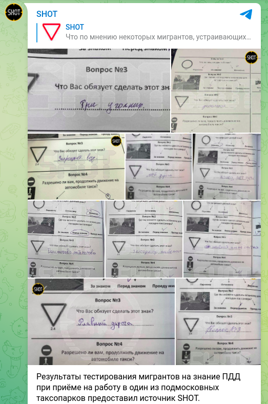 Ответы мигрантов, которые пытаются устроиться на работу в такси, могут вызывать панику. Экзамен на знание ПДД приезжие сдают из рук вон плохо. Ответы вроде "Мой дарога" встречаются сплошь и рядом.