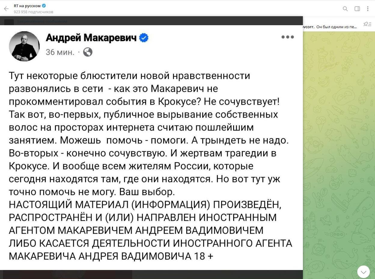 "Сочувствие" Макаревича*. Скриншот: страница телеграм-канала "RT на русском"