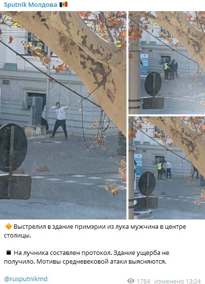 На фотографиях, которые выложил Telegram-канал "Спутник. Молдова", видно мужчину средних лет в похожей на вышиванку белой рубахе, который целится в сторону здания из самодельного лука. На двух других фотографиях со стрелком беседуют представители полиции.