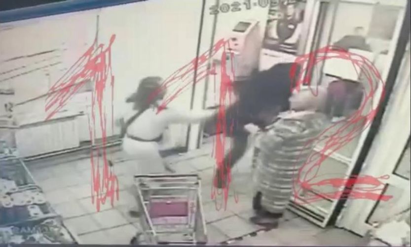 Где была в тот момент охрана магазина, не ясно, но на записи видно, что с неадекватом с топором сражается лишь эта пара, а затем женщина падает на пол у входа.