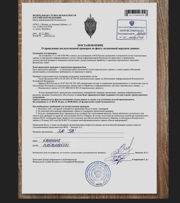 Проверка касается "утечки данных", реальность которой и хотят проверить якобы сотрудники спецслужбы. При этом в "документе" прописано, что проверка будет проводиться с помощью двух мессенджеров – национального MAX и Telegram.