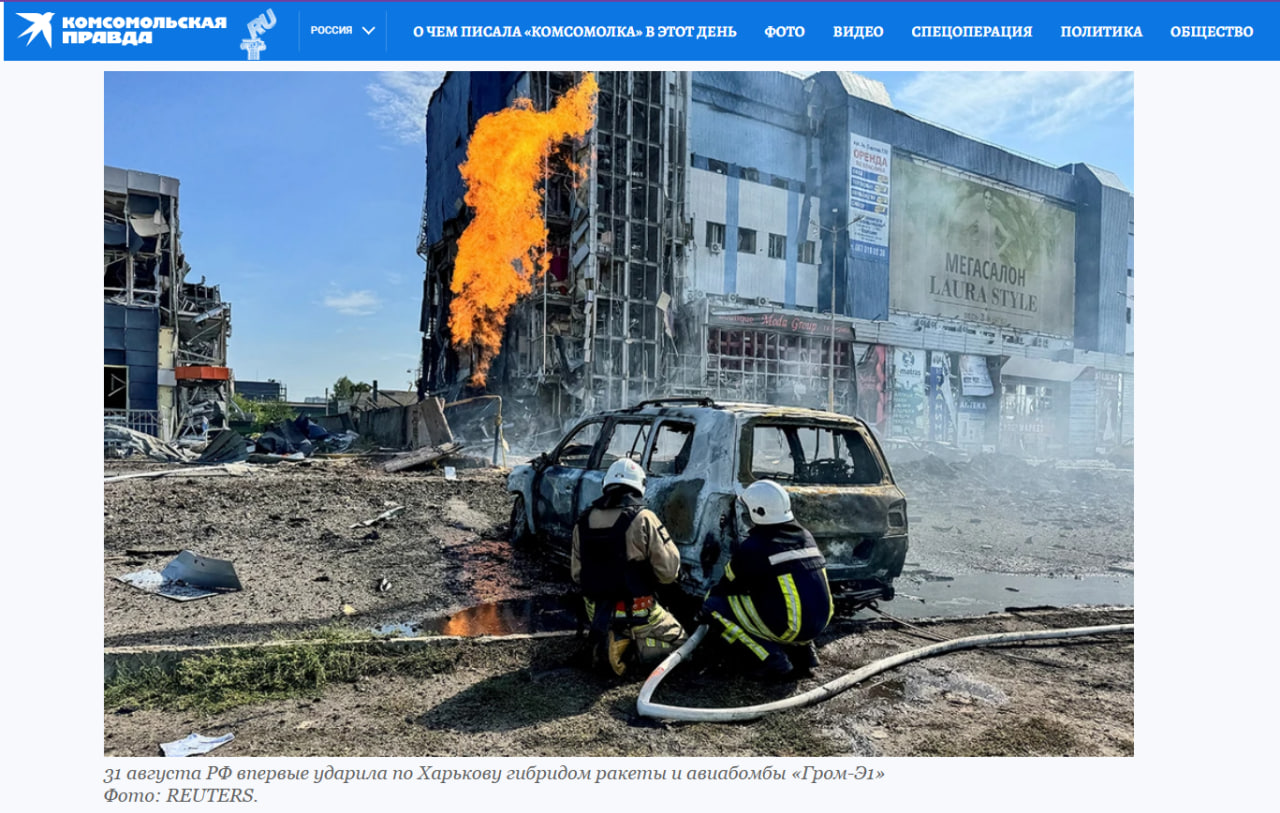 По данным западного издания Reuters, русская армия "впервые" применила гибрид ракеты и бомбы "Гром-Э1", ударив по ПВД противника в районе Харькова. С этой информацией ранее также выступил мэр города Игорь Терехов.