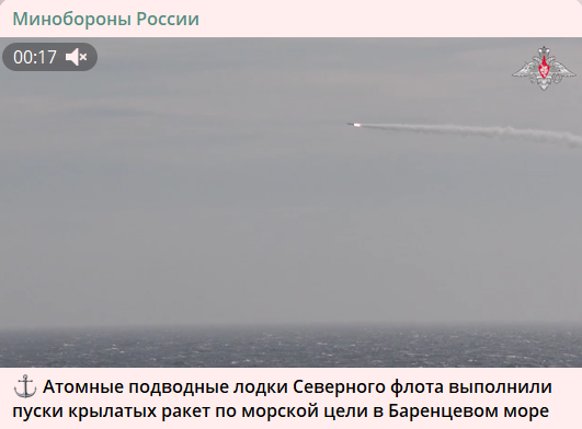 В сообщении Минобороны говорится, что атомные подводные ракетные крейсеры "Северодвинск" проекта 885 и "Орёл" проекта 949А Северного флота выполнили практическую ракетную стрельбу по морской цели в Баренцевом море. Уточняется, что мишень была непростой.